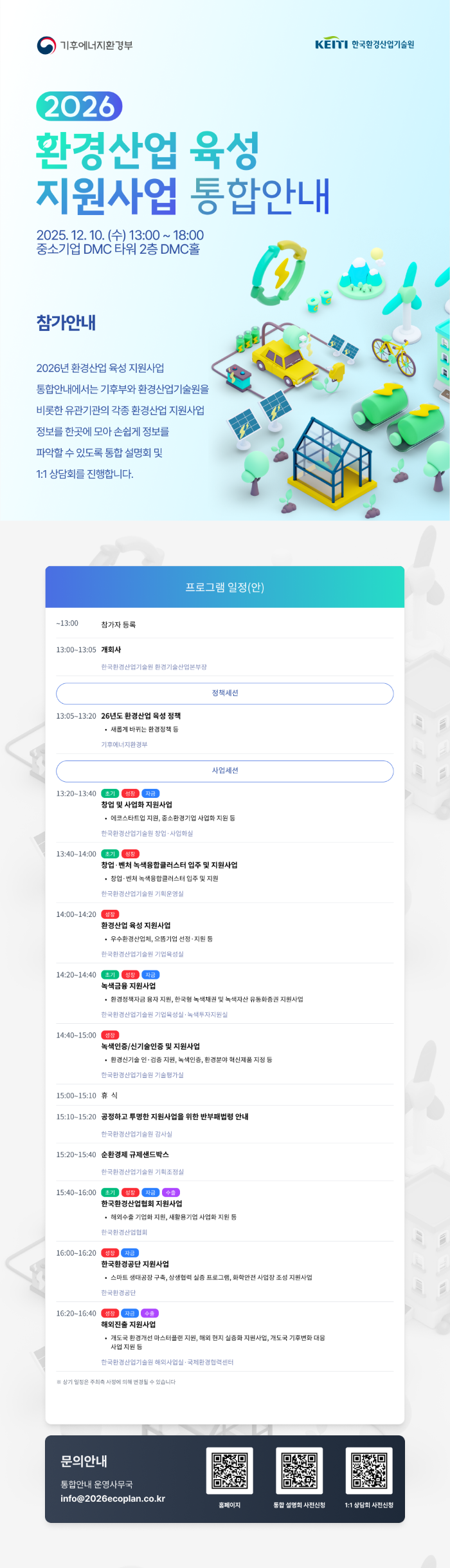 | SUBJECT | [한국환경산업기술원] 2026 환경산업 육성 지원사업 통합안내 | HITS | 1019 |