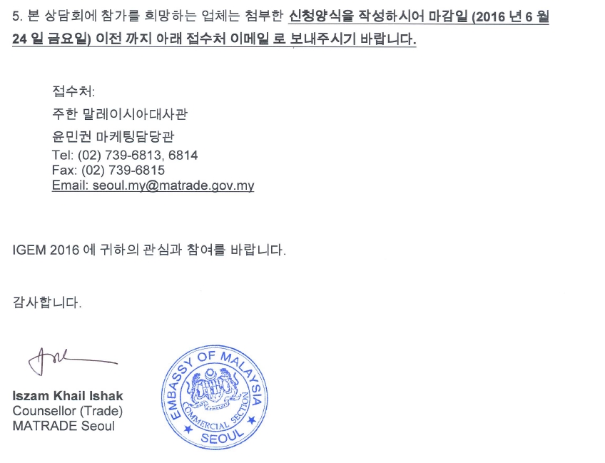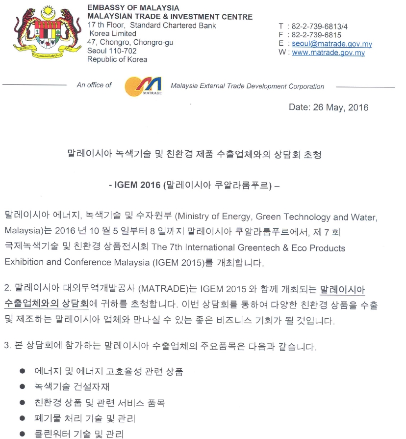 말레이시아 녹색기술 및 친환경제품 수출업체와의 상담회 초청안내
