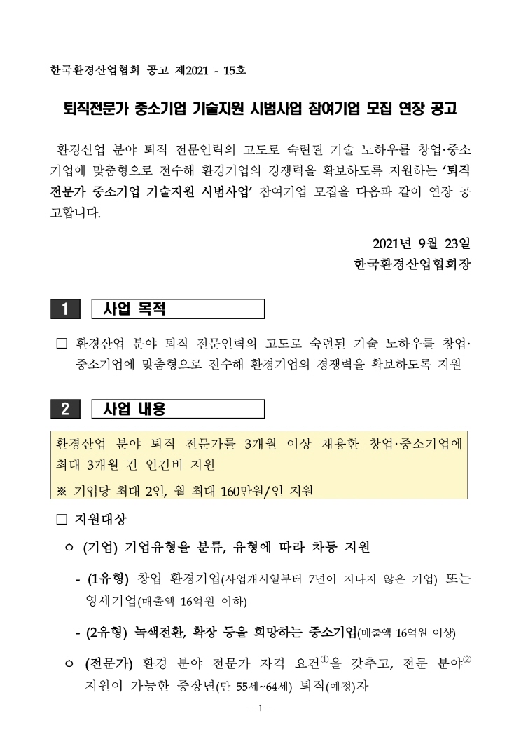 [환산협공고 제2021-15호] 퇴직전문가 중소기업 기술지원 시범사업 참여기업 모집 연장 공고.hwp