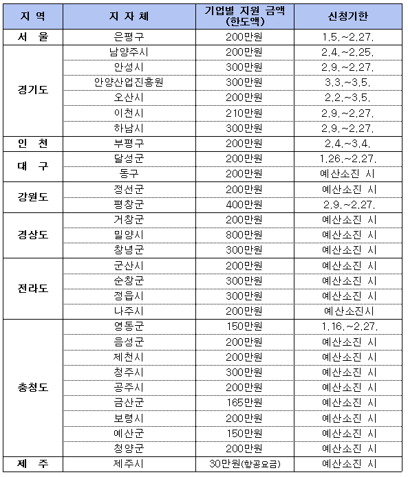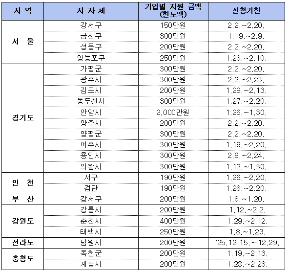지원금액 및 항목, 신청마감기한, 제외대상(연속지원 불가 등)은 지자체별로 상이합니다.